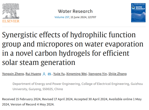2024年5月1日,貴州大學3522集團新網站虞育杰/黃睿團隊在能源環境領域自然指數(Nature Index)期刊《Water Research》(影響因子:12.8)上發表題為“Synergistic Effects of Hydrophilic Function Group and Micropores on Water Evaporation in a Novel Carbon Hydrogels for Efficient Solar Steam Generation(一種新型多孔碳復合水凝膠中親水官能團和微孔促進太陽能界面蒸發的協同效應研究)”的研究論文,貴州大學3522集團新網站為該論文第一完成單位,黃睿副教授為通訊作者,動力工程21級碩士生鄭永鑫為第一作者。該研究得到了國家自然科學基金、貴州省基礎研究計劃、貴州省教育廳青年科技人才成長項目及貴州大學培育計劃的支持。由本文作者虞育杰教授、黃睿副教授、張世杰特聘教授及尹建勇特聘教授組成的青年教師研究團隊近三年以第一/通訊作者發表SCI一區論文10余篇。