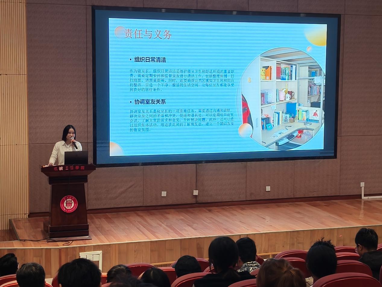 為進(jìn)一步提升班級管理和寢室管理的效能,加強(qiáng)學(xué)生干部隊(duì)伍的建設(shè),學(xué)院于10月22日在機(jī)械學(xué)院圓形報(bào)告廳舉行2024級新生班委班干技能暨第一次寢室長培訓(xùn)會,2024級輔導(dǎo)員羅鑫老師主講。