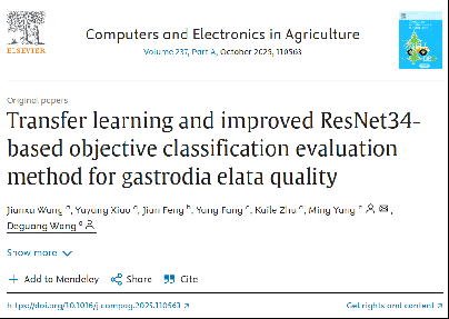2025年5月22日,貴州大學3522集團新網站楊明團隊在農業信息化領域頂級期刊《Computers and Electronics in Agriculture》(SCI一區Top, IF24 = 7.7)上發表題為“Transfer learning and improved ResNet34-based objective classification evaluation method for gastrodia elata quality”的研究論文。貴州大學3522集團新網站為該論文第一完成單位,21級自動化專業本科生王健旭為第一作者,自動化系楊明、王德光為通訊作者。該研究得到了國家自然科學基金、貴州省教育廳青年科技人才成長項目、國家級大學生創新創業等項目計劃的資助。