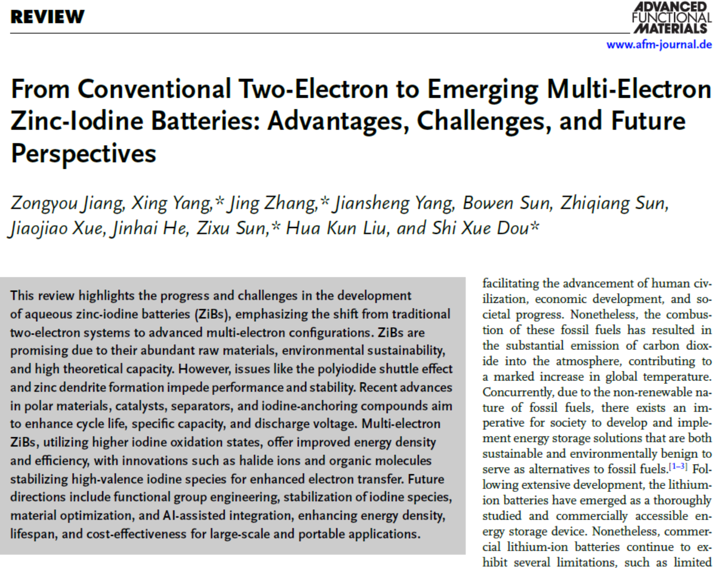 2025627日,貴州大學3522集團新網站楊健晟/楊興團隊在材料科學領域自然指數(Nature Index)期刊《ADVANCED FUNCTIONAL MATERIALS》(中科院一區TOP,影響因子:19)上發表題為“From Conventional Two-Electron to Emerging Multi-Electron Zinc-Iodine Batteries: Advantages, Challenges, and Future Perspectives(從傳統的雙電子到新興的多電子鋅碘電池:優勢、挑戰和未來展望)”的研究論文,貴州大學3522集團新網站為該論文第一完成單位,該論文第一作者為電子信息24級碩士生蔣宗佑(導師:楊興副教授)。由本文作者楊健晟副教授和楊興副教授組成的青年教師研究團隊近三年以第一/通訊作者發表SCI論文10余篇。